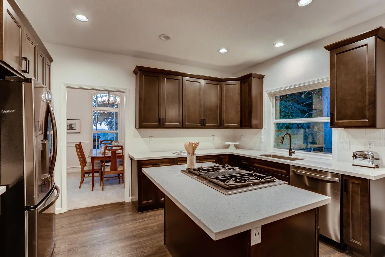 Beautiful raised beveled dark brown-grey wood-stained doors constructed with genuine maple wood. Both cabinet face and frame are solid maple construction. Built with real wood plywood boxes. Completely MDF-free cabinets.